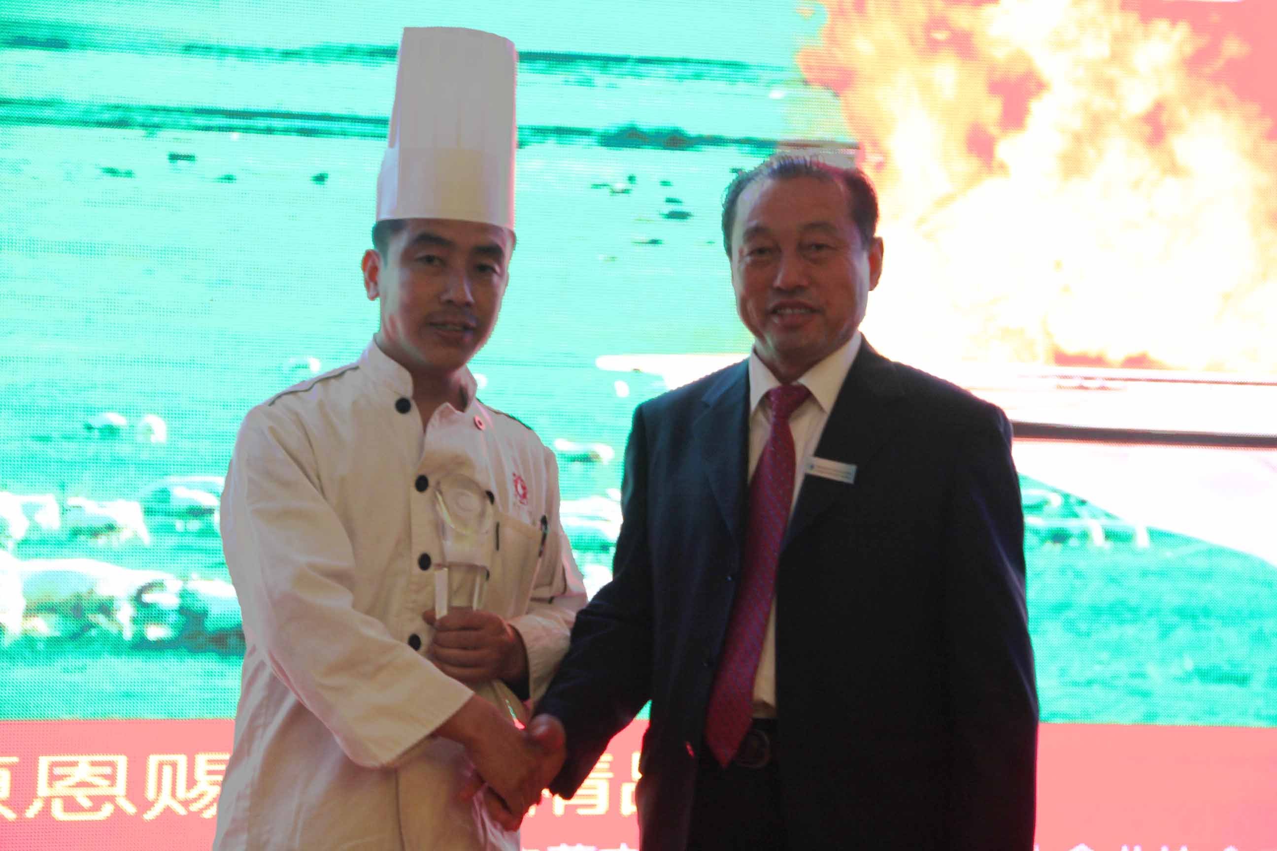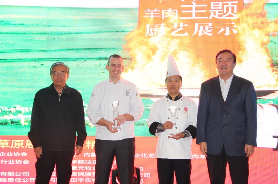 本次廚藝比拼展示主要是中法兩國廚師之間的高手對決。兩國大廚根據羊肉的不同部位烹飪出各道菜品。本次比拼的標準主要是養(yǎng)生、創(chuàng)意和具有地域特色。各評委經過仔細品嘗后評選出特等獎、一等獎各一名。最終由遠道而來的法國大廚獲得特等獎,我們中國廚師隊獲得一等獎。原副主任雷·額爾德尼和原副主席傅守正為獲獎選手頒發(fā)獎杯。