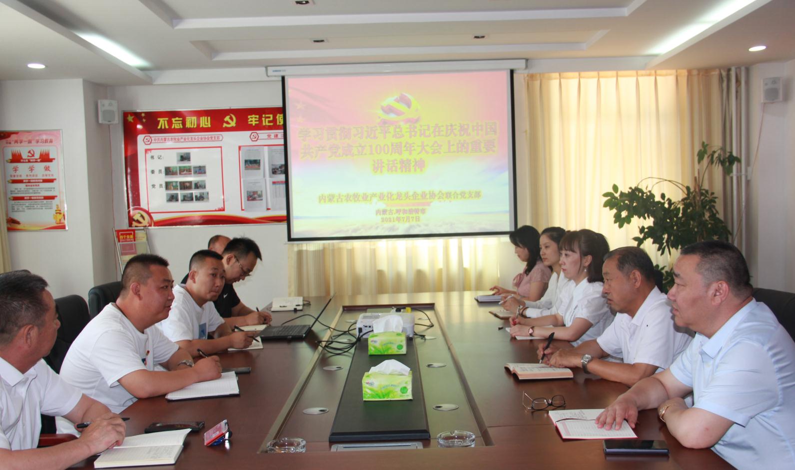 2021年7月7日上午,內蒙古農(nóng)牧業(yè)產(chǎn)業(yè)化龍頭企業(yè)協(xié)會聯(lián)合黨支部書記李陽主持召開“學習貫徹習近平總書記在慶祝中國共產(chǎn)黨成立100周年大會上的重要講話精神”座談會。協(xié)會會長周勇,執(zhí)行會長林永亮,執(zhí)行秘書長呼群等所有在呼黨員干部參加會議。