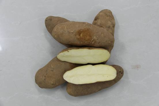 【特征特性】株型擴(kuò)散,莖粗壯,有淡紅紫色素,葉綠色,花白色,開花期短。塊莖長形,結(jié)薯麻皮較厚,呈褐色,白肉,芽眼少而淺,干物質(zhì)含量23%~24%,淀粉含量17%,還原糖含量低于0.2%。生育期120天左右。耐貯藏性良好適宜現(xiàn)代化栽培,產(chǎn)量可達(dá)4噸以上。